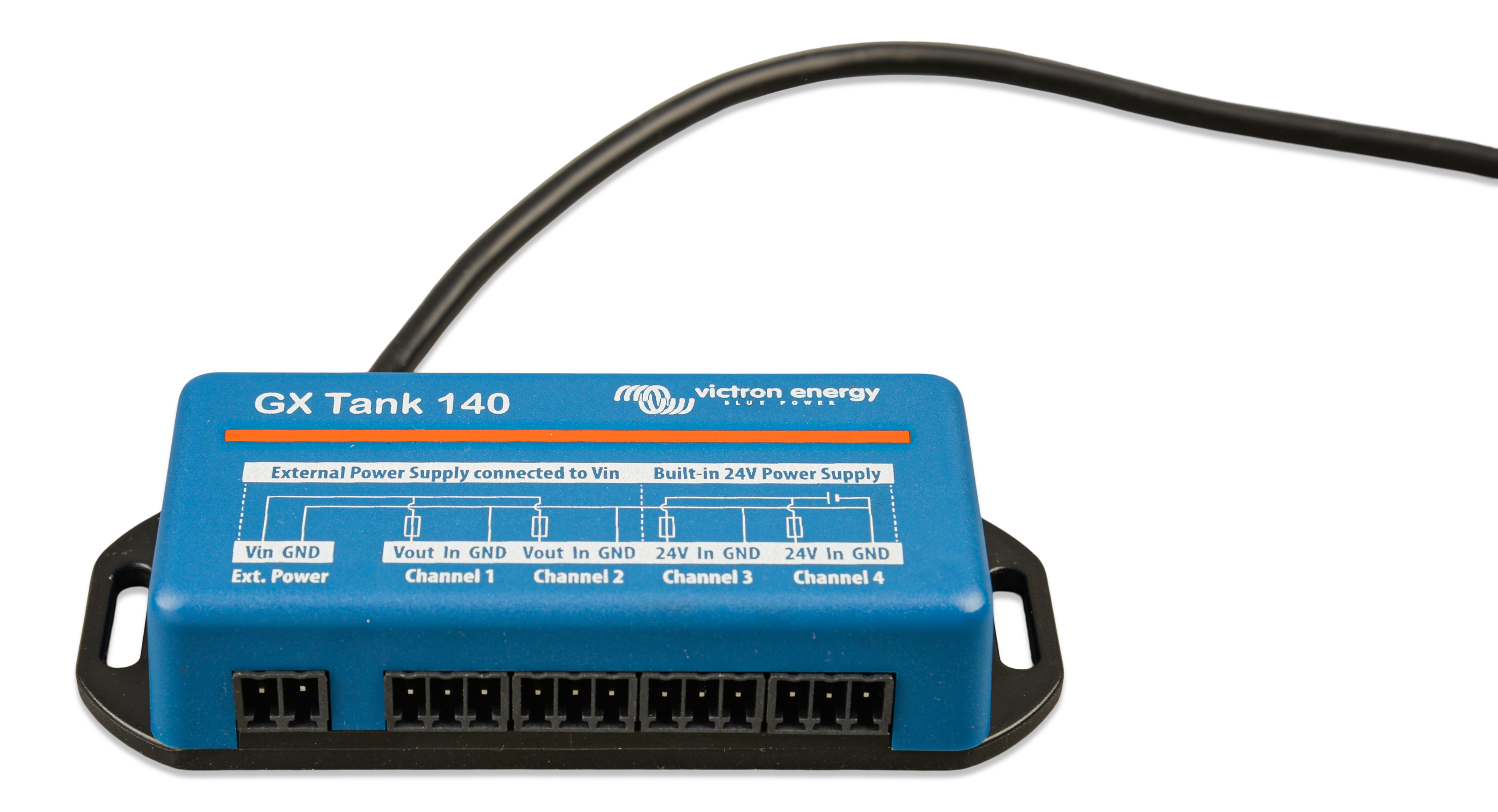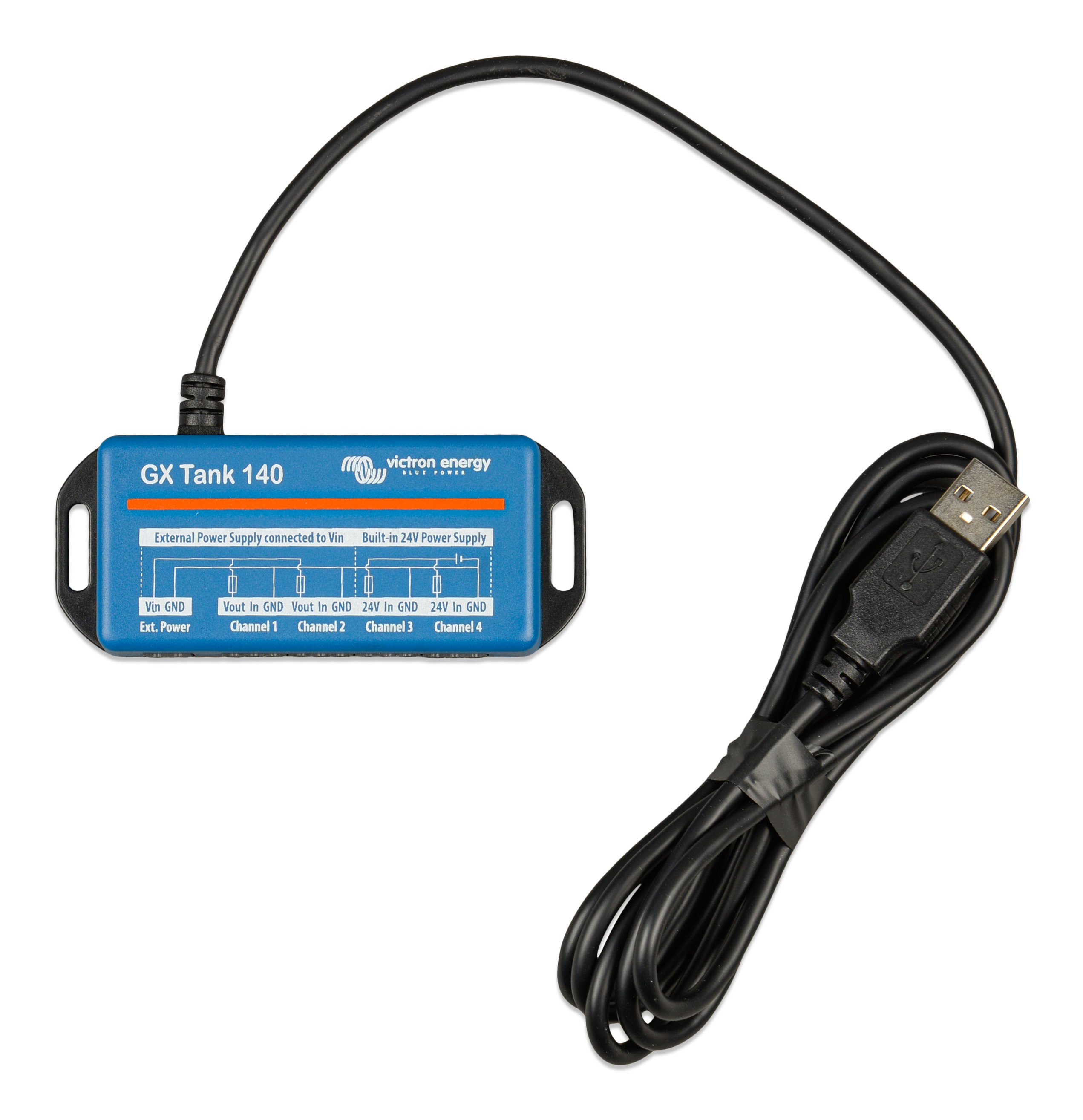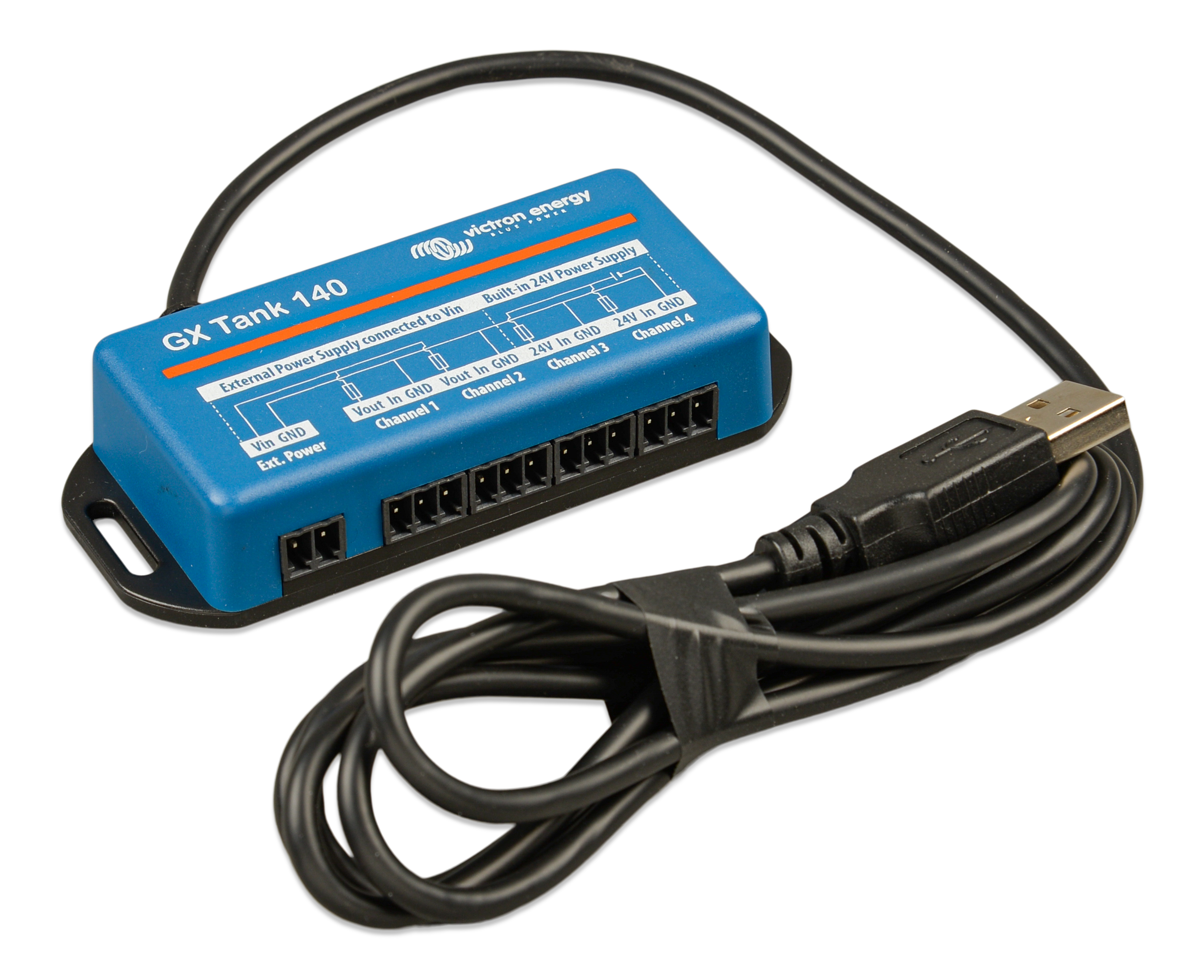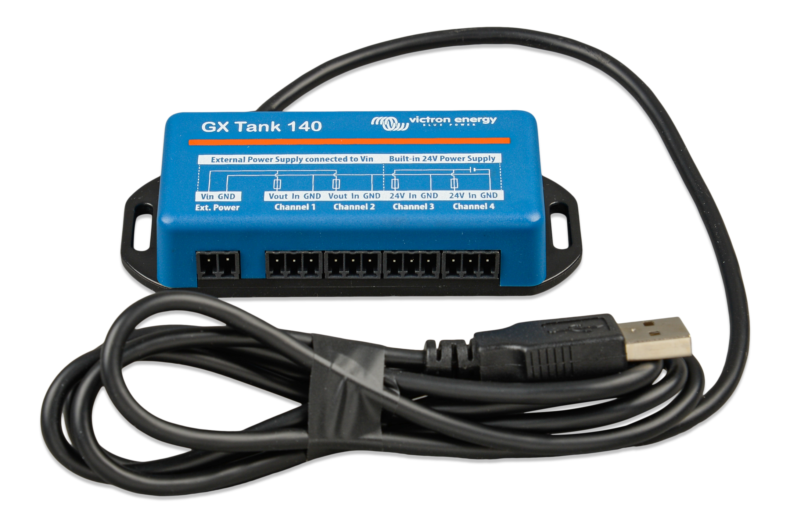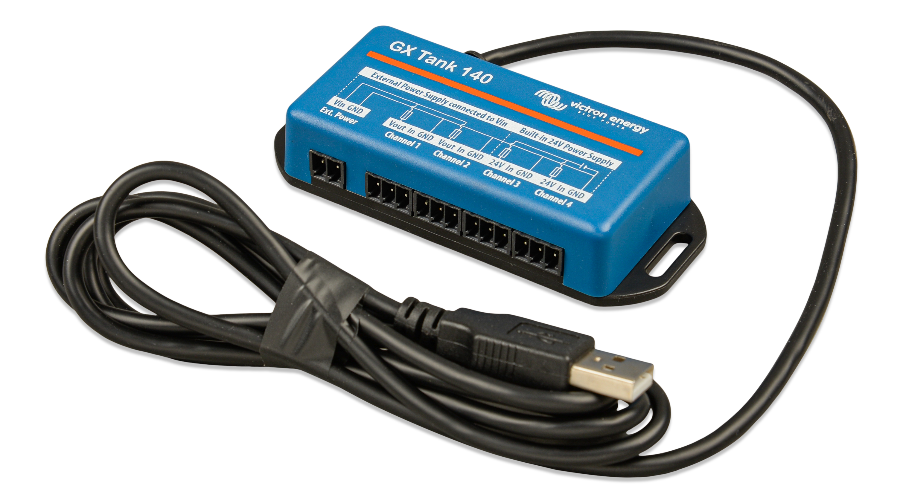 De GX Tank 140 is compatibel met zowel stroomsensoren (4 tot 20 mA) als spanningsensoren (0 tot 10V). De aansluiting op het GX-apparaat is via USB, dit is ook hoe de GX Tank 140 voeding krijgt: er zijn geen extra voedingskabels nodig.