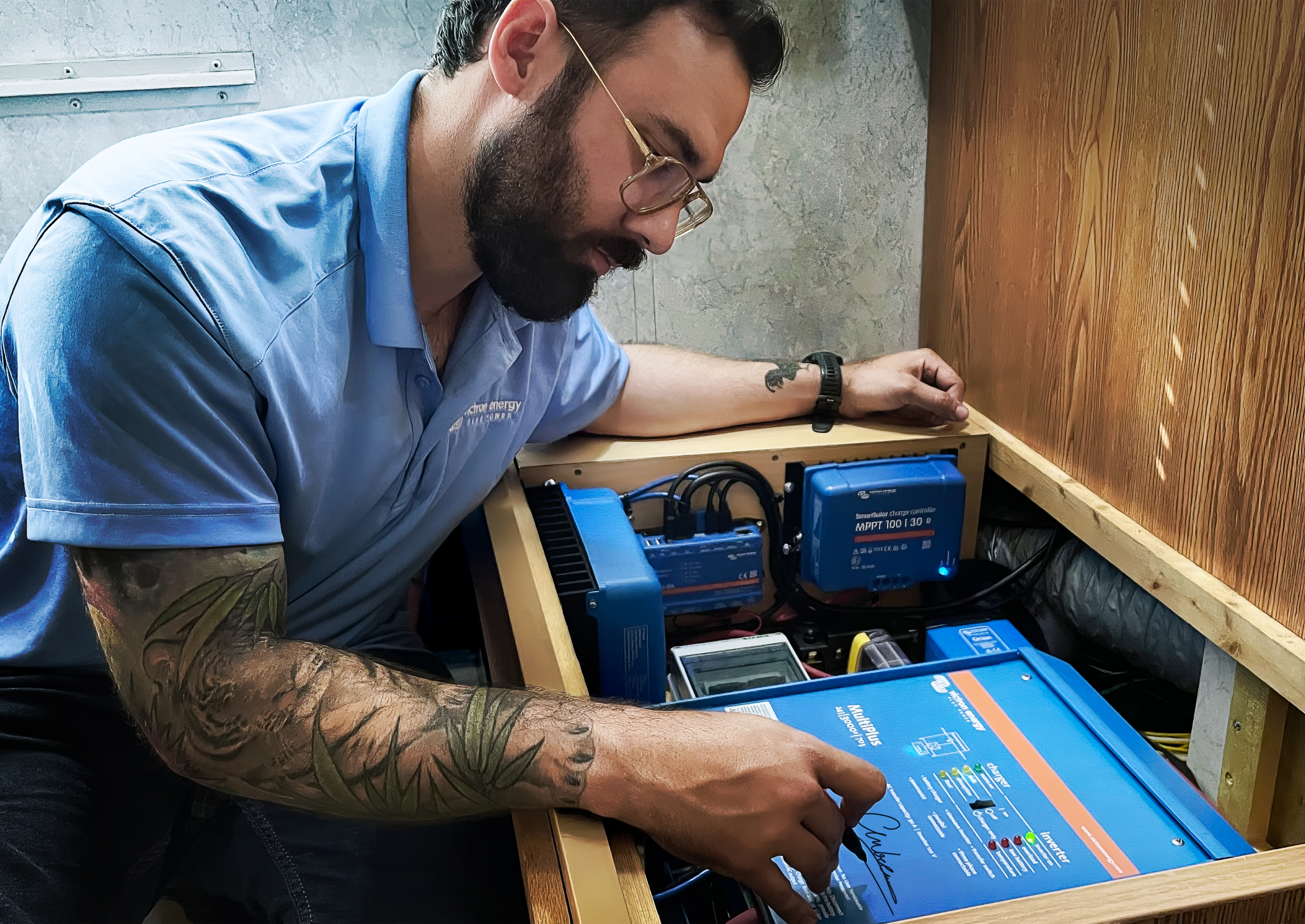 Aluca biedt flexibele en lichtgewicht-systeemoplossingen voor voertuigen en kant-en-klare ingebouwde modules. Deze bestelwagen beschikt over een Victron-systeem bestaande uit een BMV-700, MultiPlus-omvormer/lader, BatteryProtect en een 12,8V-lithiumaccu. Met dit systeem is er voldoende elektriciteit aan boord om vele gereedschappen van stroom te voorzien.